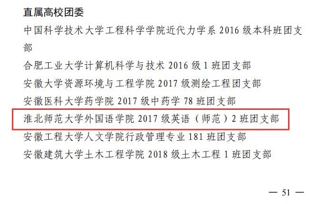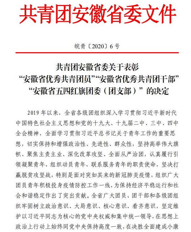 近日,共青团安徽省委下发了《共青团安徽省委关于表彰“全省优秀共青团员”“全省优秀共青团干部”“全省五四红旗团委(团支部)”的决定》(皖青[2020]6号),一帆视频 2017级英语(师范)2班团支部荣获“安徽省五四红旗团(总)支部”荣誉称号。